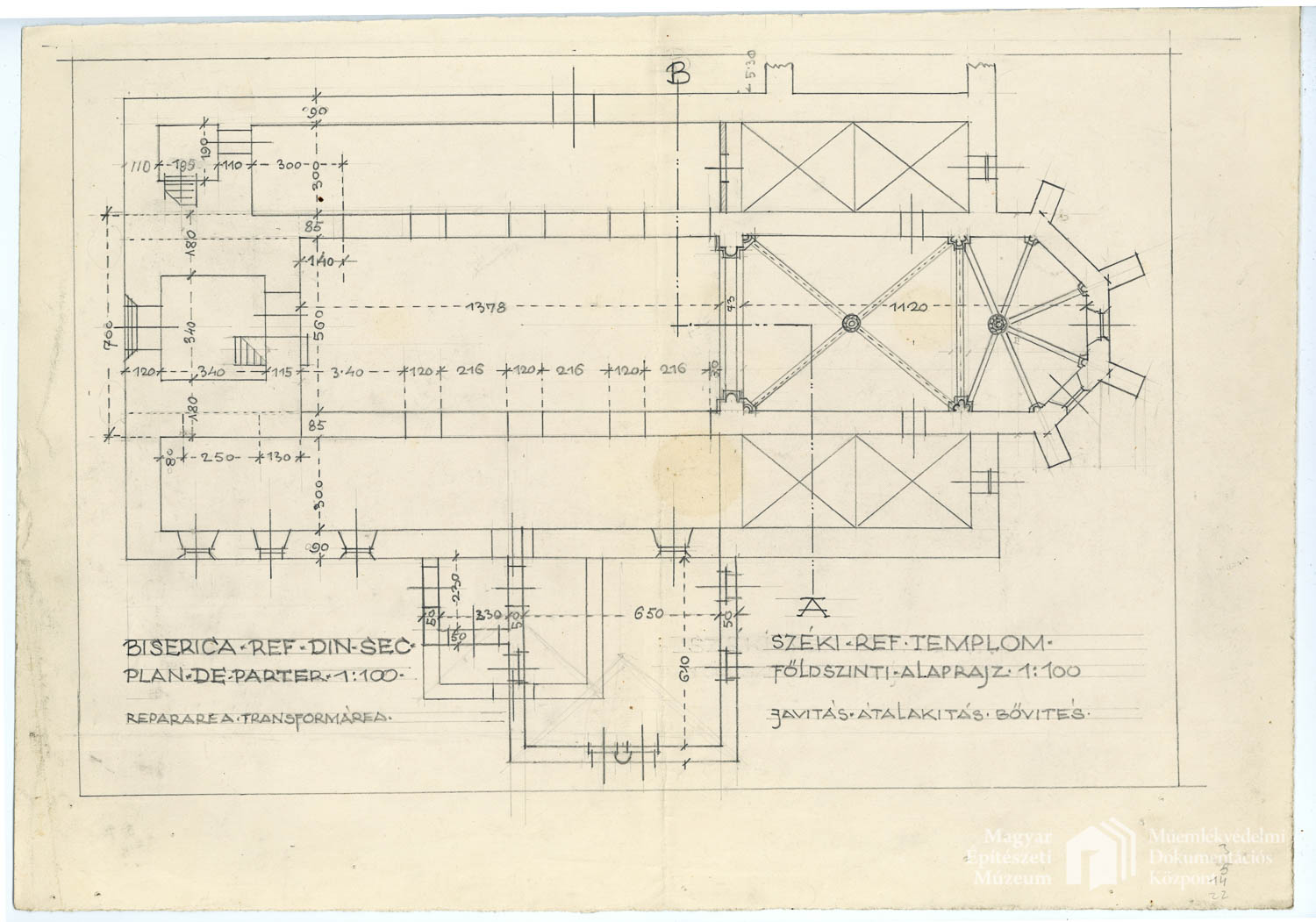 Református templom helyreállítása, Szék PreviousNext Toggle image Földszinti alaprajz Type of document Tervek Collection Magyar Építészeti Múzeum és Műemlékvédelmi Dokumentációs Központ Related work Református templom helyreállítása, Szék Reference code MEM MDK 2020.1.53.10 Author Kós Károly Letöltés PreviousNext