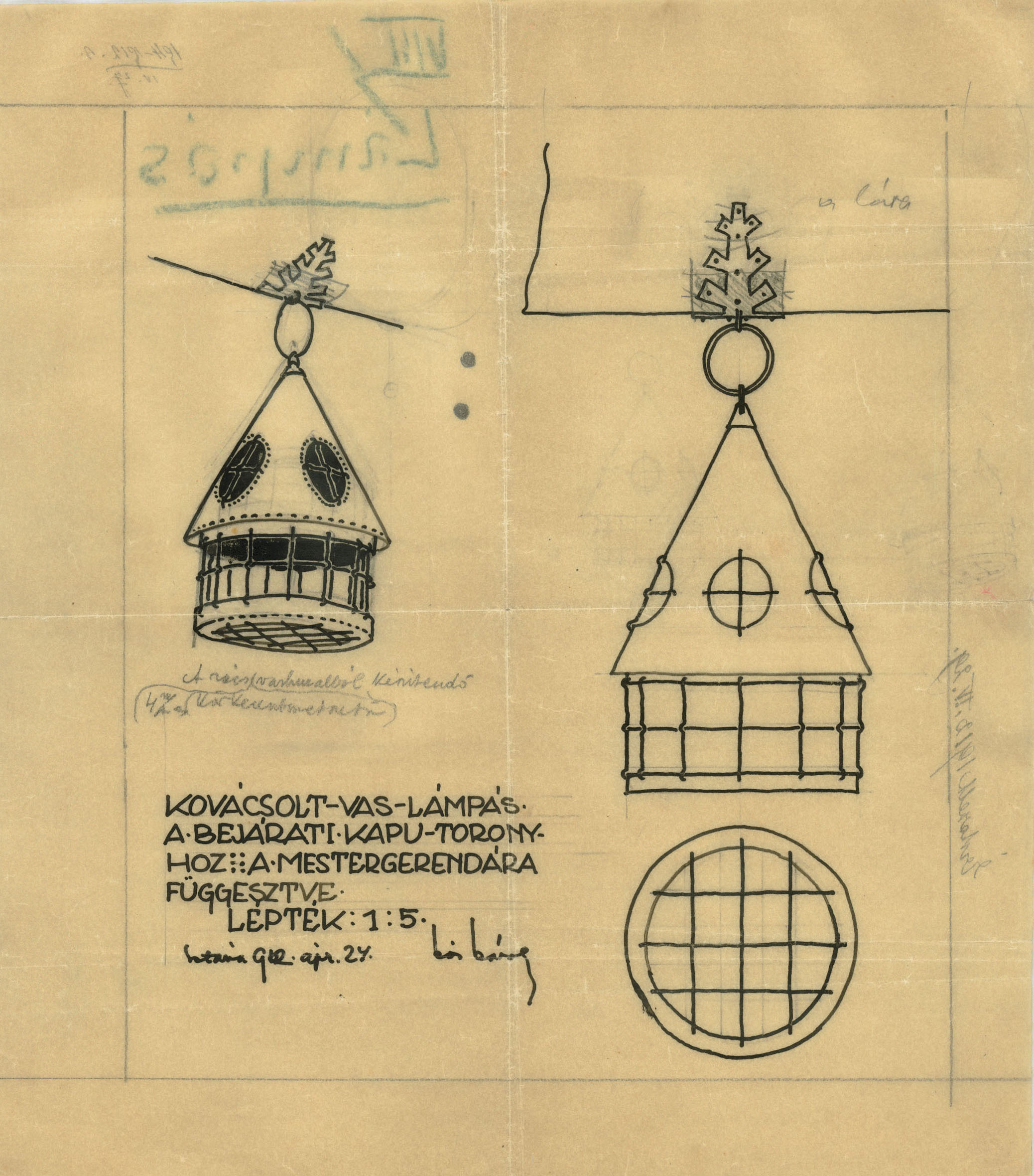 Wrought iron lantern for the tower entrance, suspended from the master beam