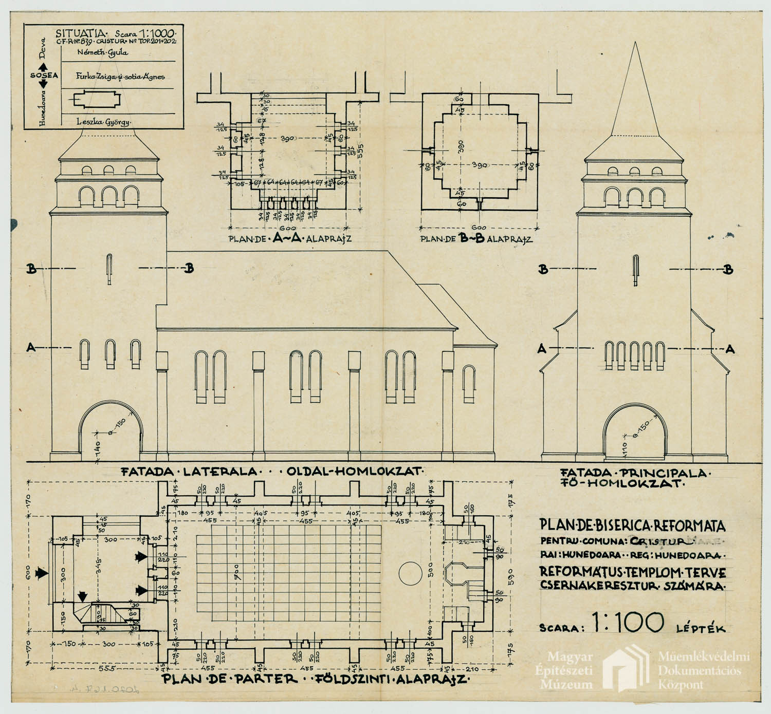 Református templom, Csernakeresztúr PreviousNext Toggle image Alaprajz, főhomlokzat, oldalhomlokzat, helyszínrajz Dokumentum típusa Tervek Keletkezés ideje 1948 1948 Őrzési hely Magyar Építészeti Múzeum és Műemlékvédelmi Dokumentációs Központ Vonatkozó alkotás Református templom, Csernakeresztúr Jelzet 2020_1_67_4 Szerző Kós Károly Építtető "Református Egyház Méretarány M=1:100 Letöltés PreviousNext