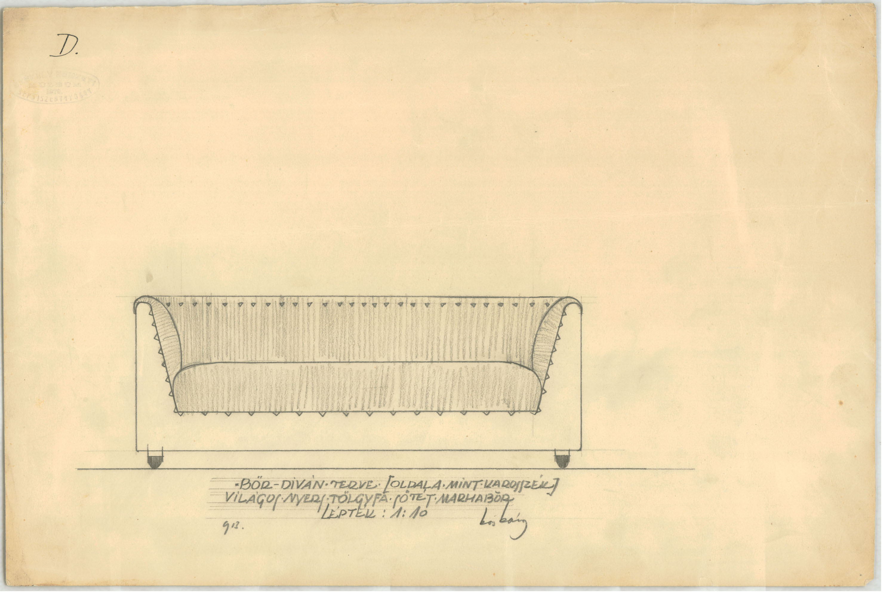 Székely Nemzeti Múzeum, Sepsiszentgyörgy PreviousNext Toggle image Bőrdívány terve világos nyers tölgyfa, sötét marhabőr Dokumentum típusa Berendezési terv Keletkezés ideje 1913 Őrzési hely Székely Nemzeti Múzeum Vonatkozó alkotás Székely Nemzeti Múzeum, Sepsiszentgyörgy Szerző Kós Károly Méretarány 1:10 Letöltés PreviousNext
