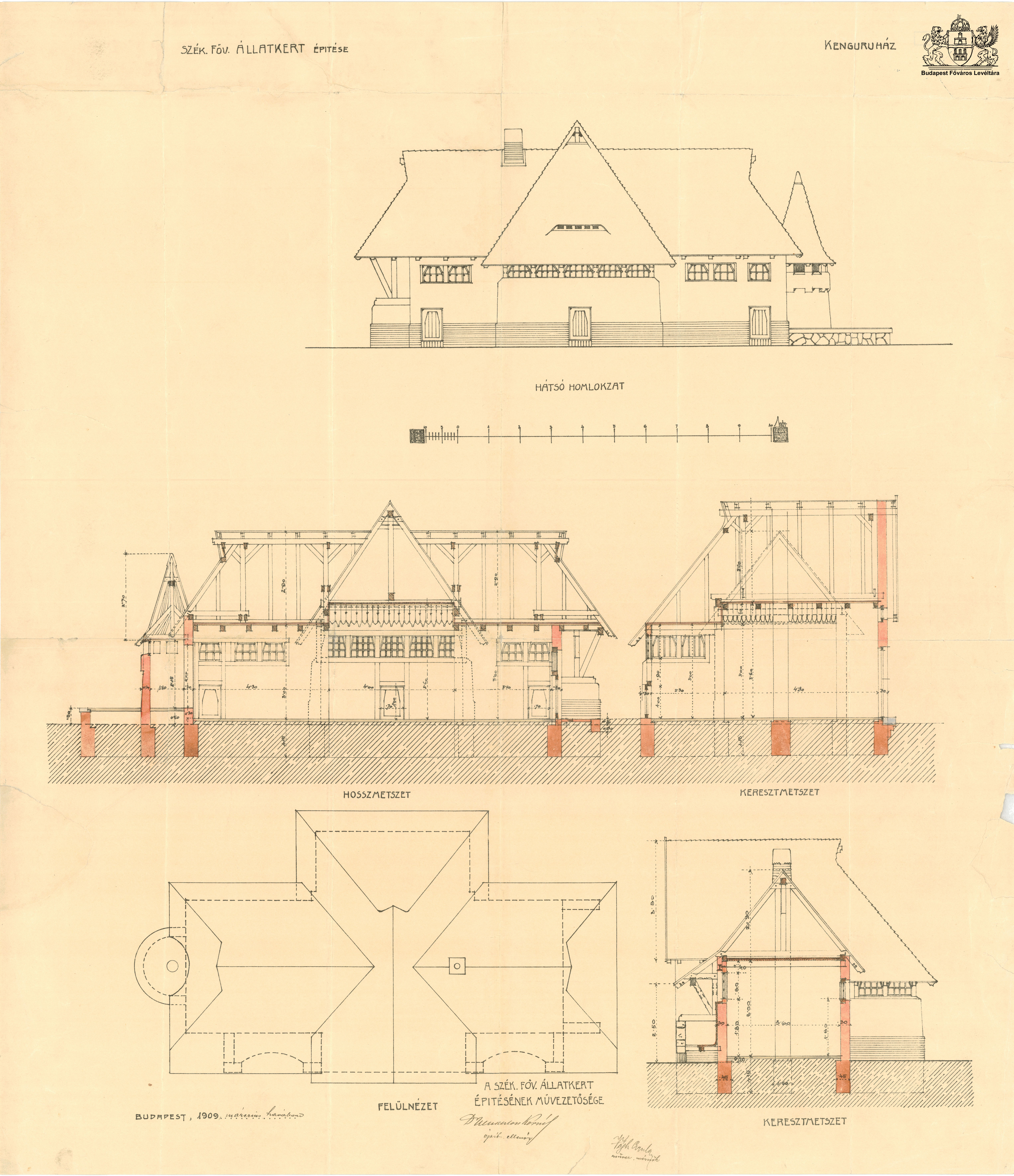 Kenguruház (Budapest Főváros Állat- és Növénykertje) PreviousNext Toggle image Felülnézet, hátsó homlokzat, metszetek Végh Gyula és Neuschloss Kornél aláírása Dokumentum típusa Tervek Keletkezés ideje 1909.03 Őrzési hely Budapest Főváros Levéltára Vonatkozó alkotás Kenguruház (Budapest Főváros Állat- és Növénykertje) Jelzet HU BFL XV.17.d.328.szor 1/46-1 Szerző Kós Károly Zrumeczky Dezső Építtető Budapest Székesfőváros Letöltés PreviousNext