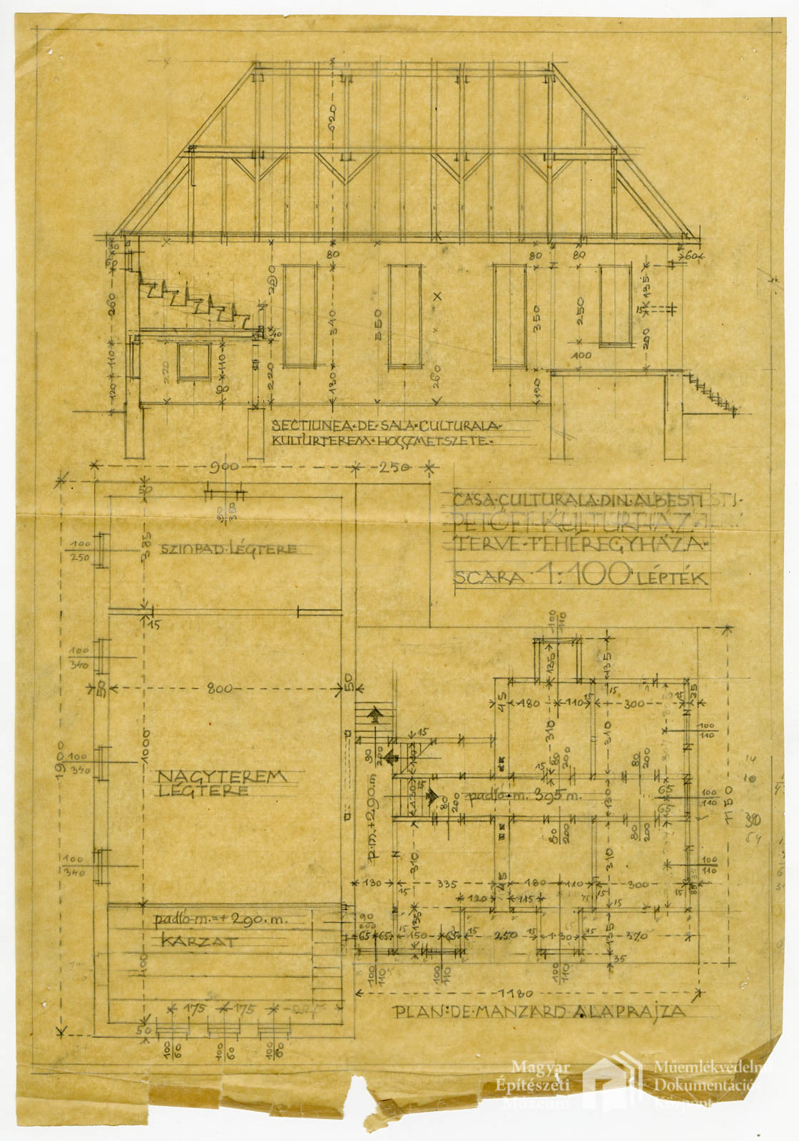 Petőfi művelődési ház és Petőfi emlékoszlop, Fehéregyháza PreviousNext Toggle image Manzárd alaprajz, kultúrterem hosszmetszete Dokumentum típusa A művelődési ház tervei Őrzési hely Magyar Építészeti Múzeum és Műemlékvédelmi Dokumentációs Központ Vonatkozó alkotás Petőfi művelődési ház és Petőfi emlékoszlop, Fehéregyháza Jelzet MEM MDK 2020.1.54.6 Szerző Kós Károly Letöltés PreviousNext